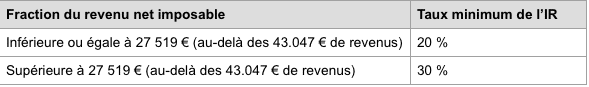 Ainsi seule la fraction des revenus – au-delà du seuil de 43 047 € – est ensuite soumise à l’impôt sur le revenu, avec application du barème progressif jusqu’à 45 % et du quotient familial, assorti d’un taux minimum de 20% ou 30% comme précisé dans le tableau suivant :