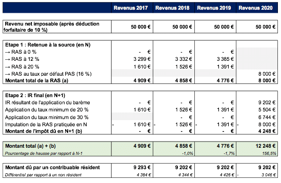 Illustration 1 : Soit un contribuable non résident (veuf et sans enfant à charge) dont la pension nette imposable s’élève à 50 000 €.