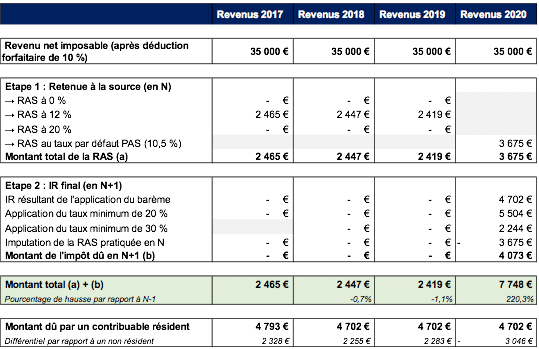 Alors que précédemment la retenue à la source acquittée libérait partiellement les contribuables non résidents de l’IR (avec un taux maximum de retenue à la source de 12% jusqu’à 43.047 euros), ils devront désormais s’acquitter dès le premier euro d’un impôt calculé au taux minimum de 20 % – jusqu’à 27.519 € de revenu net – et de 30% au delà.