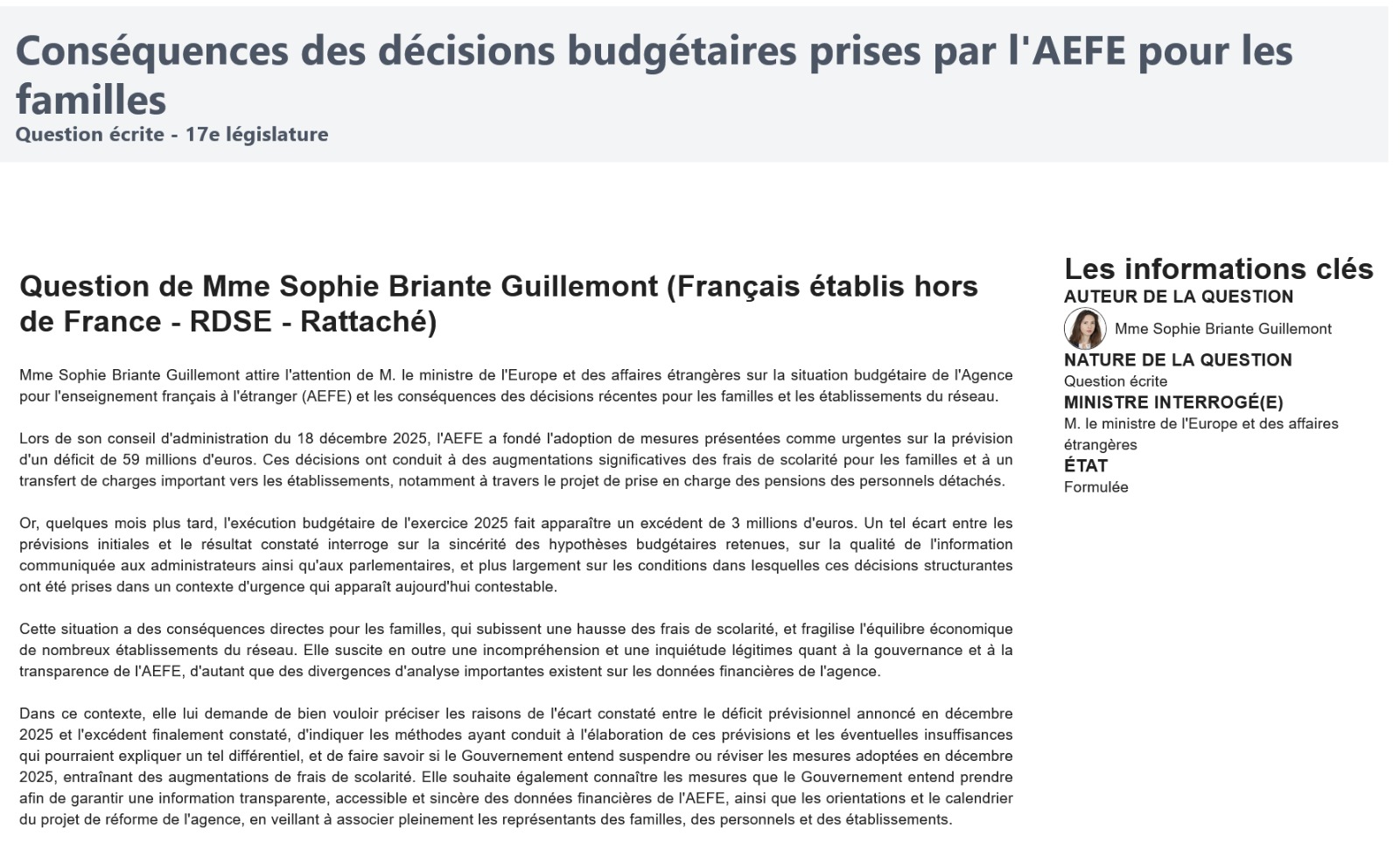 Elle insiste également sur la nécessité de garantir une information financière transparente, accessible et sincère concernant l’AEFE.